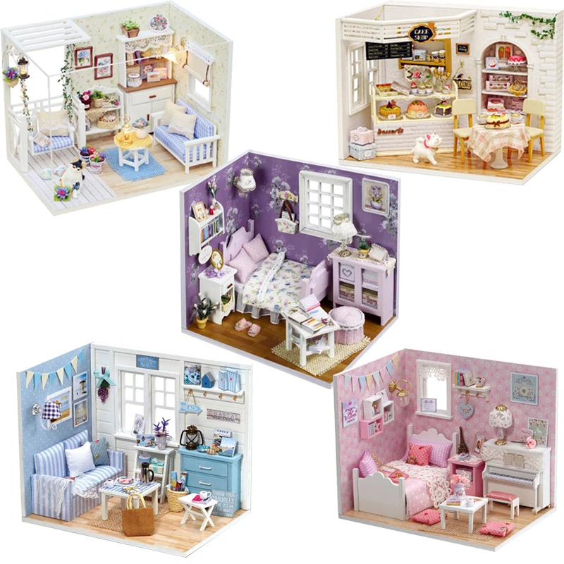 Günstige Kaufen DIY Puppe Haus Miniatur Puppenhaus Modell Mit 3D Möbel Und Staub Abdeckung Holz Puppe Haus Kreative Spielzeug Für Kinder # E Preise Online