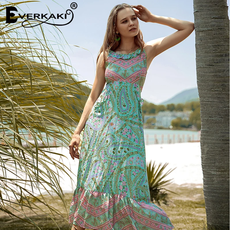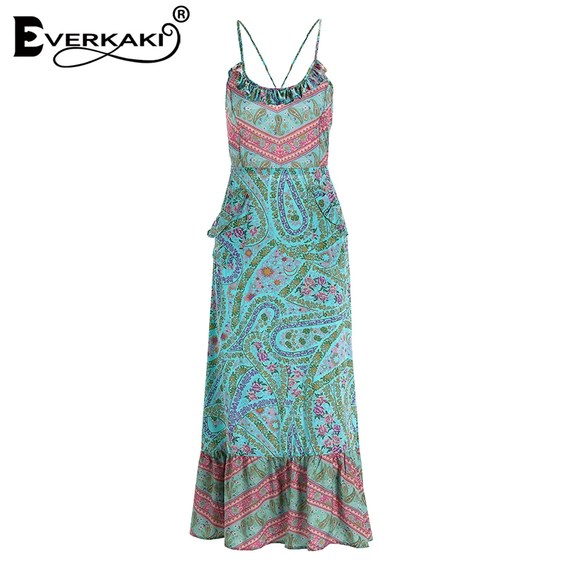 Billige Kaufen Everkaki Paisley Floral Boho Midi Kleid Lace Up Backless Strand Lange Sommer Kleid Spaghetti Böhmischen Party Kleid 2019 Preise Online
