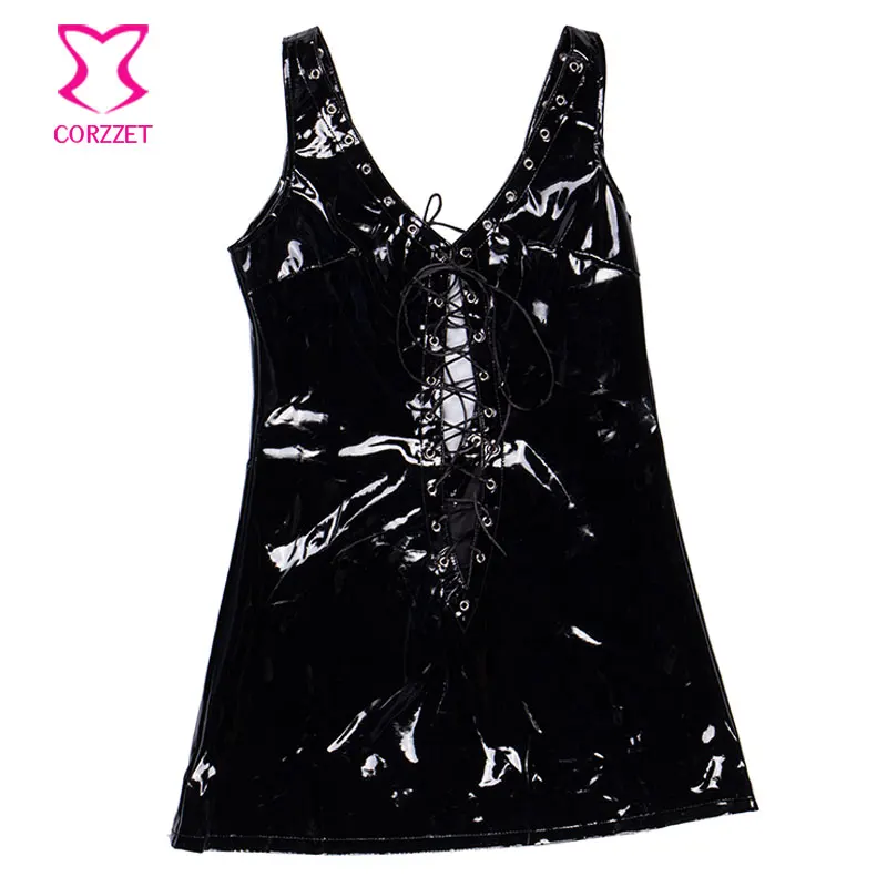 Kaufen Billig Schwarz PU PVC Leder Vorn Und Hinten Lace Up Tiefem V neck sleeveless short mini sexy party kleider nachtclub dress 2017 Clubwear Preise Online