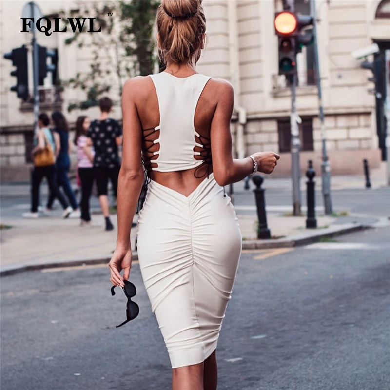 . Günstige Kaufen FQLWL Spitze Up Midi Sexy Kleid Frauen Verband Bodycon Heißer 2018 Sommer Kleid Club Tragen Backless Weiß Plissee Party Kleider vestiod Preise Online.