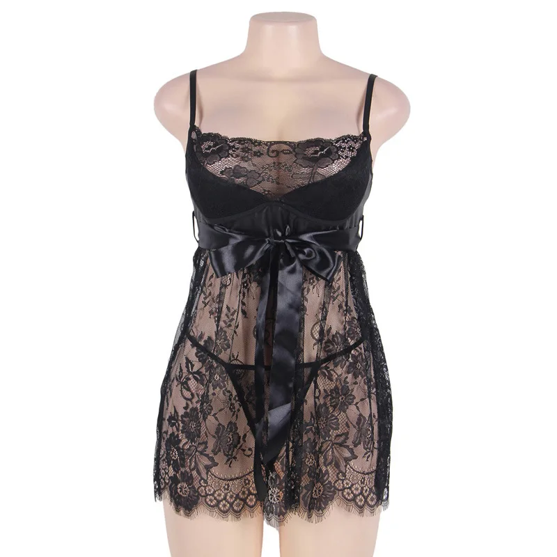 Billige Kaufen Wimpern Spitze Sexy Lingerie Erotic M ~ 5 XLTransparent Babydoll Heißen Sex Kleidung Mesh Schwarz Kleid Backless Nachtwäsche mit Satin gürtel Preise Online