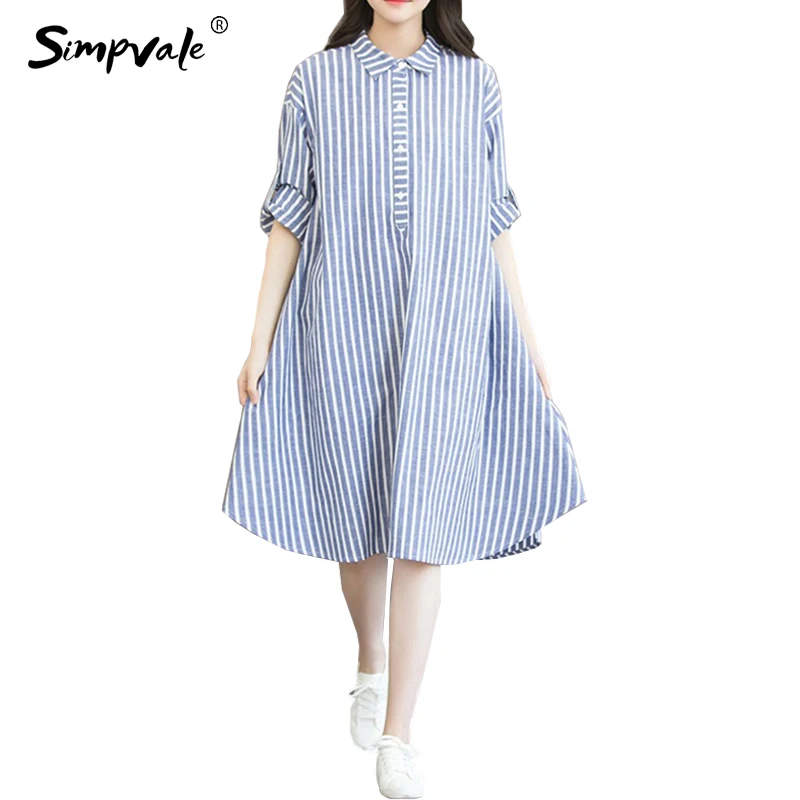 Günstige Kaufen SIMPVALE Große Größe Gestreiften Kleid Shirts Sommer Frauen Blau Und Weiß Casual Kleider Kurze Button Up Kleid Elegante Preise Online