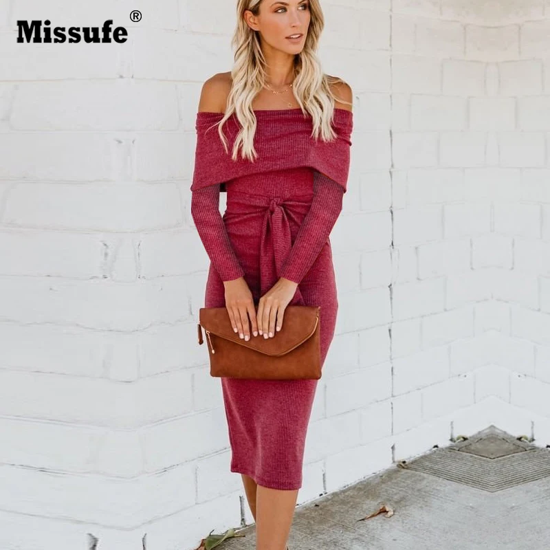 Günstige Kaufen Missufe Lace Up Winter Frauen Dünne Bandage Tunika Weibliche Vestidos Herbst Kleider Sexy Slash Neck Off Schulter Party Kleid Preise Online